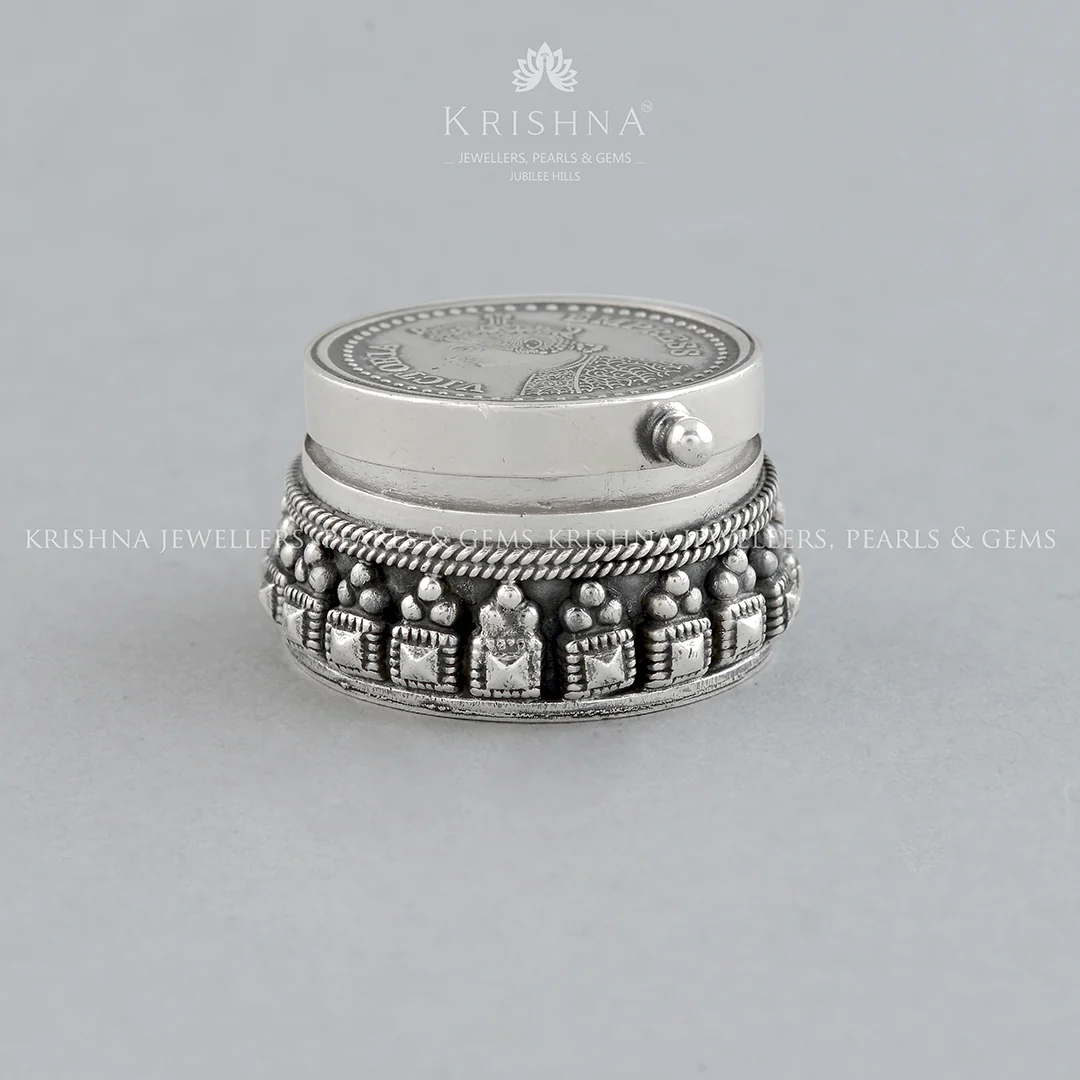 Crafted with 92.5 pure silver, this Exquisite Victoria Empress Design Antique Style Kumkum Bharani is a stunning piece of art. Perfect for storing kumkum, it adds an elegant touch to any decoration or pooja room. With its intricate design, it is sure to impress any product or industry expert.